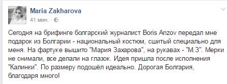 "На днешния брифинг Борис Анзов ми предаде подарък от България - национална носия, шита специално за мен. На престилката е избродирано "Мария Захарова", а на ръкавите - "М.З". Мерки не са ми вземали, но ми вземали, но ми стана идеално", доволна е говорителката на руското МВнР.