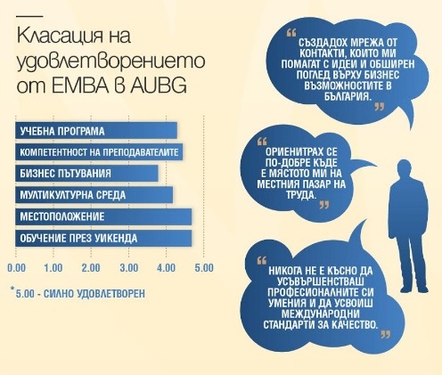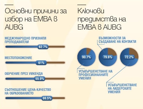 Основните причини за избор на EMBA на AUBG пред други подобни програми са съотношението между цената и качеството на обучението (посочено от 69. 5% от запитаните), международно признатите професори (62. 7%), удобните часове (55. 9%) и града на провеждане на лекциите- София (61%). 82% от завършилите и днес работят в София, а 89% от тях са българи.
