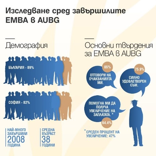 Изследването бе проведено сред представителна извадка от всички студенти, завършили ЕМBA на AUBG от 2003 до май 2013 г. Целта му е да определи как абсолвентите на първата EMBA в страната оценяват и определят най-големите ползи от програмата за тяхното лично и професионално развитие. Средната възраст на завършилите е 38 години и най-голямата част от тях (35. 6%) са на мениджърска позиция в интернационални компании, опериращи на местния пазар.