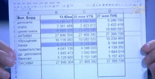 При Сашо Диков той показа документ, от който се вижда как от валутния борд преди и след затварянето на КТБ са изтеглени на два пъти по 700 милиона лева, които вероятно са изтекли в чужбина. Според него, БНБ е нарушавала през последните години Закона за валутния борд като е печатала неразрешени банкноти и така е поддържала изкуствено борда.