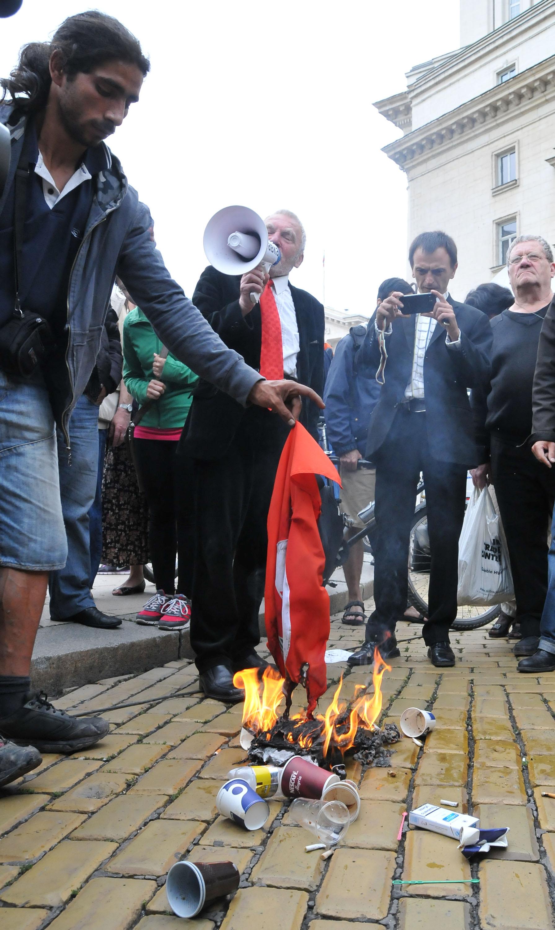/КРОСС/ Протестиращи подпалиха знамето на БСП, хвърлиха го на земята, започнаха да го тъпчат, а после изхвърлиха отгоре му чаша кафе, вестници и боклуци. Инициаторите на акта пред президенството обясниха, че това е в отговор на запаления европейски флаг на 9 май.
