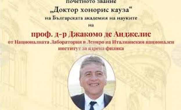 /КРОСС/ Българската академия на науките ще удостои със званието „Доктор хонорис кауза" италианския ядрен физик проф. д-р Джакомо де Анджелис. Тържествената церемония по връчване на почетното звание ще се състои на 11 октомври от 11:00 часа в зала „Проф. Марин Дринов" на БАН (ул. „15-ти ноември" № 1).