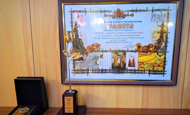 /КРОСС/ Почетната статуетка на Министерството на туризма „Златна роза" - стилизиран образ на символа на българския туризъм, е вече в офицерската каюткомпания на борда на българския военен научноизследователски кораб „Св. Св. Кирил и Методий".