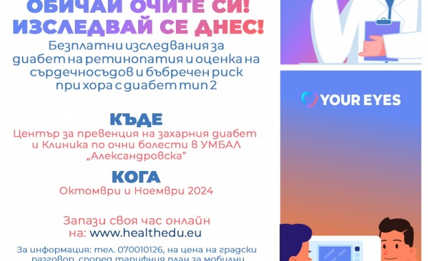 /КРОСС/ В периода 21 октомври - 15 ноември, екип от ендокринолози и офталмолози на УМБАЛ „Александровска" ще проведат безплатни изследвания на хора с диабет тип 2 в Центъра за превенция на захарния диабет и в Клиниката по очни болести на болницата. Записването е задължително и важи само за лица с поставена диагноза. Пациентите с диабет тип 1 се проследяват много по-усърдно от своите лични лекари и други специалисти.