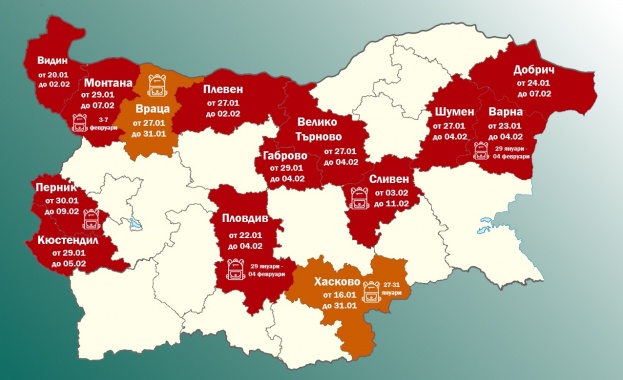 Припомняме, че учениците не са присъствено в клас и в областите Перник, Пловдив, Варна. Училищата са затворени също във Враца и Хасково до утре - 31 януари, когато ще бъде направена нова преценка дали въведените мерки ще бъдат удължени.