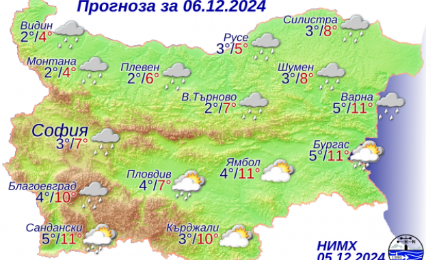 Утре слаб дъжд ще превалява в Северна България и на места в югозападните райони и Горнотракийската низина. Ще духа слаб вятър от изток-североизток, а в Източна България - от югоизток. Вечерта вятърът в много райони ще стихне. Минималните температури ще бъдат между 2° и 7°, максималните - между 4° и 9°, в южните райони до 12°. За София минимална температура - около 3°, максимална - около 7°.