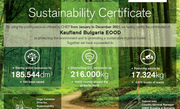 /КРОСС/ София, 4.07.2023 г. - Kaufland България получи сертификат за спестени 119 тона въглеродни емисии през 2022 г. от компанията CHEP (Commonwealth Handling Equipment Pool), част от Brambles group, която управлява глобална система за споделяне и повторно използване на оборудване. Количеството спестени емисии е в резултат на използването на многократни палети в логистичната дейност на веригата и се равнява на количеството, което би отделил един камион, за да обиколи земното кълбо три пъти.
