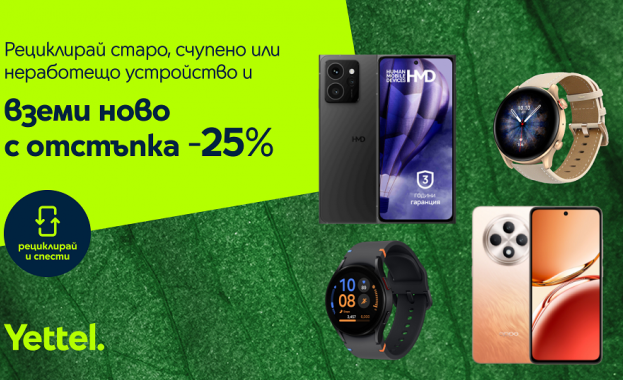 /КРОСС/ До края на месеца всеки клиент на Yettel може да се възползва от 25% отстъпка от цената на избрани нови устройства при връщане на стар смартфон, таблет или смарт часовник за рециклиране, независимо от състоянието им, чрез услугата „Рециклирай и спести". През септември моделите, участващи в кампанията, са OPPO Reno12 FS 5G 512GB, HMD Skyline 5G 256GB, SAMSUNG Galaxy Watch FE BT, RIVERSONG Motive 6C Pro.
