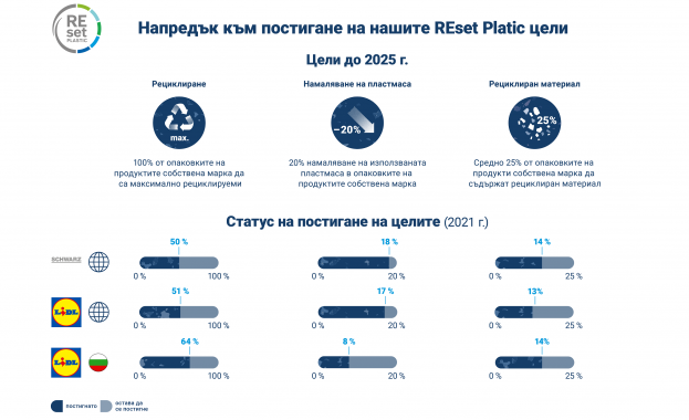 - За изминалата година Лидл България отчита максимална рециклируемост при 64% от опаковките на продукти собствена марка, давайки своя положителен принос за средна стойност от 51% за ритейл веригата на международно ниво. Средната стойност за всички подразделения на Schwarz Group пък е точно 50%, което съответства на половината от поставената цел да направи 100% от опаковките на продуктите собствена марка максимално рециклируеми до 2025 г.