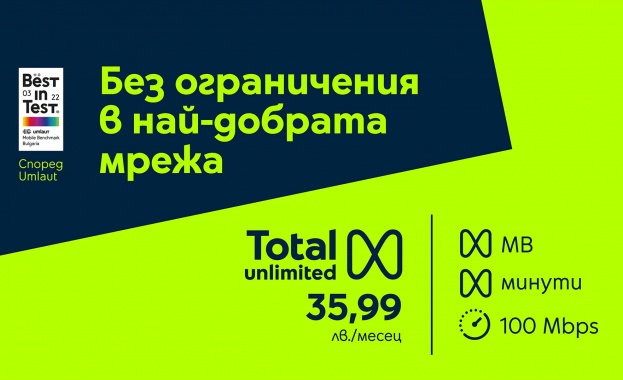Благодарение на плановете Total Unlimited клиентите могат да разчитат на най-добрата мрежа с 5 поредни Best in Test сертификата от umlaut, неограничени минути за разговори в България и роуминг в ЕС, както и с неограничените МВ в страната на скорости, започващи от 100 mbps за Total Unlimited 35.99 и достигащи до неограничена скорост при Total Unlimited 59.99.