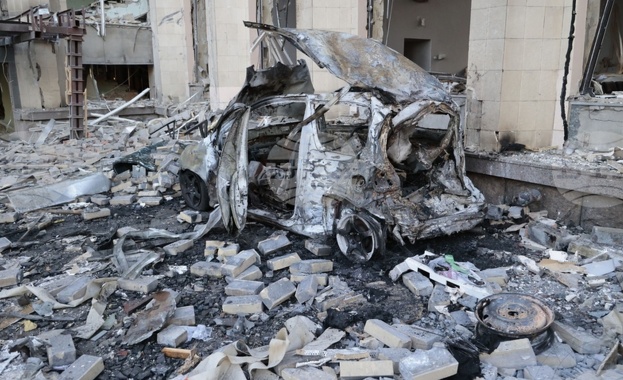 Повреден е главният вход на сградата, унищожени са и няколко автомобила близо до зданието, уточни в канала си в "Телеграм" градската администрация.