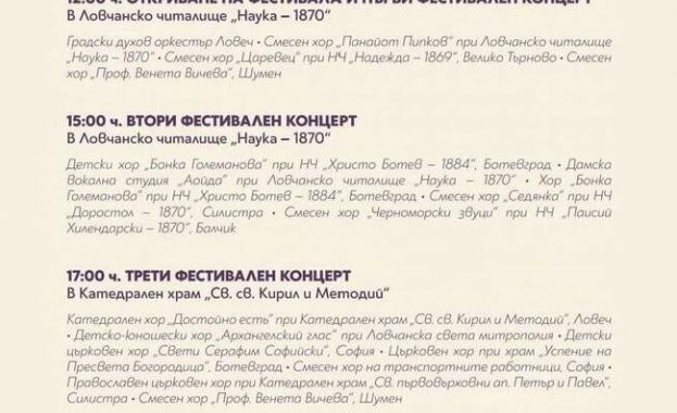 В първия концерт на сцената на Ловчанско читалище „Наука - 1870 г." ще се качат Градски духов оркестър Ловеч, Смесен хор „Панайот Пипков" при Ловчанско читалище „Наука - 1870 г.", Смесен хор „Царевец" - Велико Търново, Смесен хор „Проф. Венета Вичева" - Шумен.