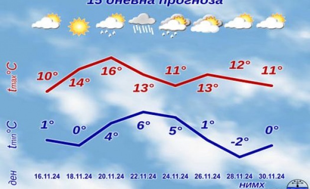 Във вторник (19 ноември) вятърът ще се ориентира от юг-югозапад и ще се усили. Ще преобладава слънчево време с разкъсана средна и висока облачност. Минималните температури ще са между минус 3° и 2°, а максималните - между 12° и 17°. В сряда (20 ноември) ще продължи да духа умерен, в Източна България и северно от планините и временно силен юг-югозападен вятър, който ще се прояви като фьон; вечерта в Северозападна България вятърът ще се ориентира от северозапад. Облачността ще се увеличава и вплътнява и до вечерта на отделни места в западните и южните райони ще превали слаб дъжд. Температурите ще се повишат още и в районите чувствителни на южен вятър дневните ще достигат 18°-20°.