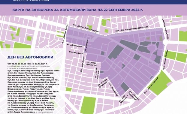 От 08.00 до 20.00 часа на 22 септември се забранява влизането на пътни превозни средства в зоната ограничена от бул. „Тодор Александров", бул. „Кн. Ал. Дондуков" бул. „Васил Левски", ул. „Граф Игнатиев", ул. „Алабин", ул. „Позитано" и бул. „Христо Ботев". Движение ще има по граничните улици и булеварди на зоната, а в нея ще могат да навлизат автомобилите със специален режим на Спешната помощ, пожарната и полицията, градския транспорт, автомобили на живущите в района, както и тези обслужващи съгласуваните събития и тържествени церемонии. Затворените за движение улици в центъра на града можете да видите тук.