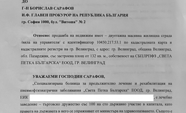 /КРОСС/ Министерството на здравеопазването сезира прокуратурата за случая с продажба на недвижим имот на двуетажна масивна сграда /Вила на управителя/, собственост на „Специализирана болница за продължително лечение и рехабилитация на пневмофтизиатрични заболявания „Света Петка Българска" ЕООД, гр. Велинград.
