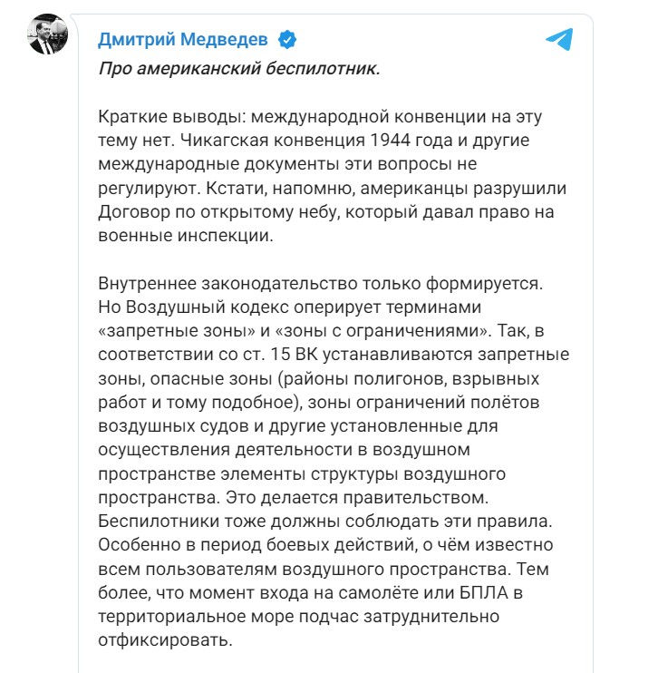 „Кратки изводи: няма международна конвенция по този въпрос. Чикагската конвенция от 1944 г. и други международни документи не уреждат тези въпроси. Между другото, напомням, че американците унищожиха Договора за открито небе, който даваше право на военни инспекции.
