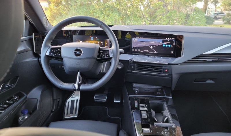 Впечатление при хибридната версия на Astra прави отличния баланс между електромотора и двигателя с вътрешно горене, вторият от които се включва буквално елегантно, когато е наложително, и по същия начин се деактивира, когато не е необходима неговата намеса в процеса по задвижването на автомобила. Трансформацията на колата от 100% електрическа към такава с хибридно задвижване става изключително неусетно, като на момента най-добрата индикация за нейната работа си остава специалното цветово изпълнение на показанията на моментната скорост, което в BEV режим е синьо.