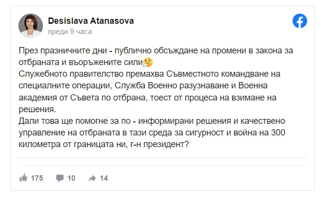 "Служебното правителство премахва Съвместното командване на специалните операции, Служба Военно разузнаване и Военна академия от Съвета по отбрана, тоест от процеса на взимане на решения. Дали това ще помогне за по-информирани решения и качествено управление на отбраната в тази среда за сигурност и война на 300 километра от границата ни, г-н президент?", написа още Десислава Атанасова.