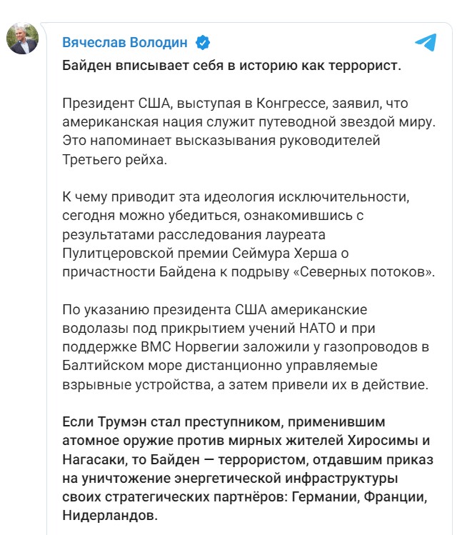 „Ако бившият президент на САЩ Хари Труман стана престъпник, използвал атомни оръжия срещу цивилните в Хирошима и Нагасаки, тогава Байдън стана терорист, който нареди унищожаването на енергийната инфраструктура на своите стратегически партньори: Германия, Франция, Холандия. Това беше акт на сплашване на неговите васали, които решиха да развиват икономиката, ръководейки се от интересите на собствените си граждани", написа още Володин.