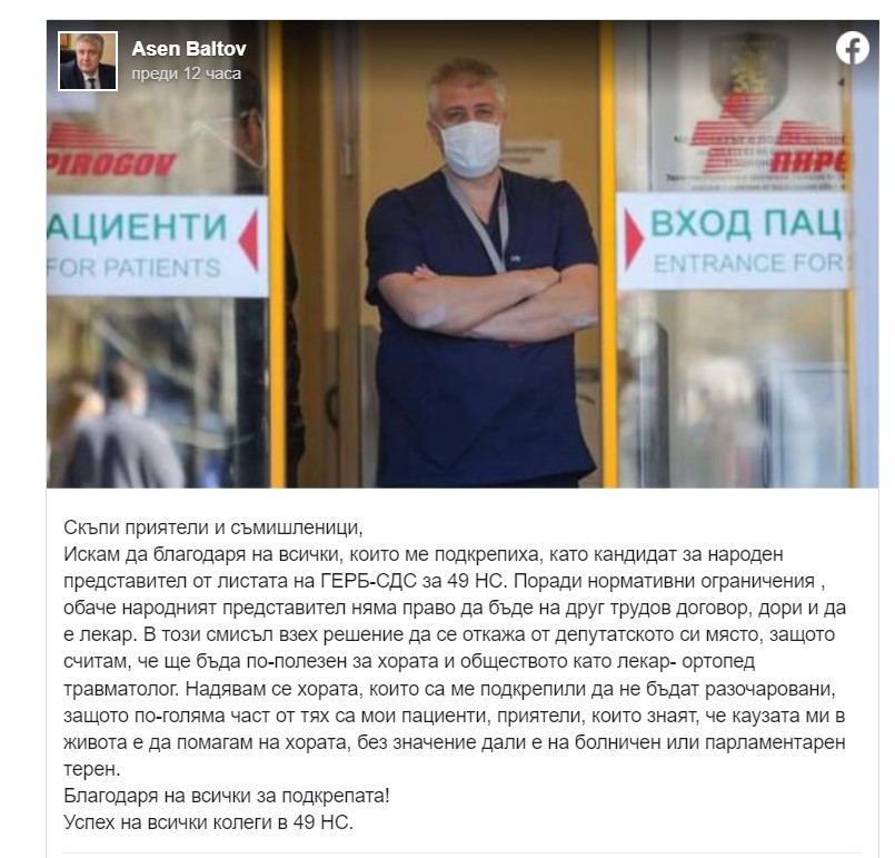 "Искам да благодаря на всички, които ме подкрепиха като кандидат за народен представител от листата на ГЕРБ-СДС за 49-ото НС. Поради нормативни ограничения обаче народният представител няма право да бъде на друг трудов договор, дори и да е лекар. В този смисъл взех решение да се откажа от депутатското си място, защото считам, че ще бъда по-полезен за хората и обществото като лекар-ортопед травматолог", написа Балтов във фейсбук.