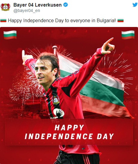 /КРОСС/Ръководството на "Байер" Леверкузен честити Деня на независимостта на всички българи. Немският клуб публикува снимка с лика на Димитър Бербатов и българския флаг, съобщи gong.bg