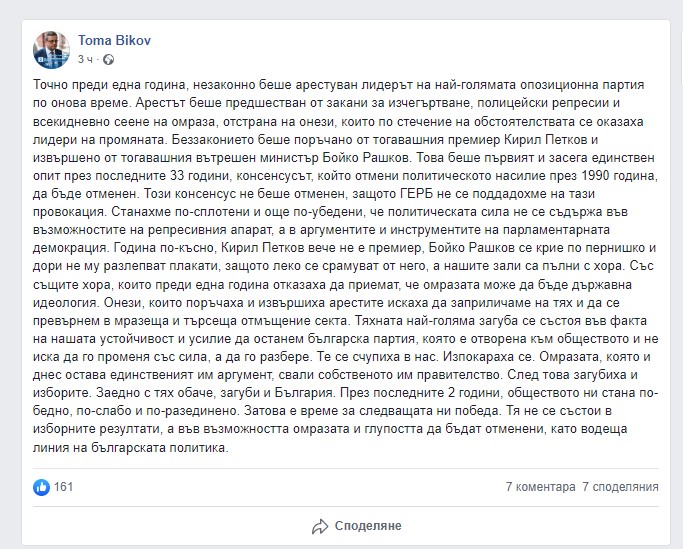 Със същите хора, които преди една година отказаха да приемат, че омразата може да бъде държавна идеология. Онези, които поръчаха и извършиха арестите искаха да заприличаме на тях и да се превърнем в мразеща и търсеща отмъщение секта. Тяхната най-голяма загуба се състоя във факта на нашата устойчивост и усилие да останем българска партия, която е отворена към обществото и не иска да го променя със сила, а да го разбере. Те се счупиха в нас. Изпокараха се. Омразата, която и днес остава единственият им аргумент, свали собственото им правителство.