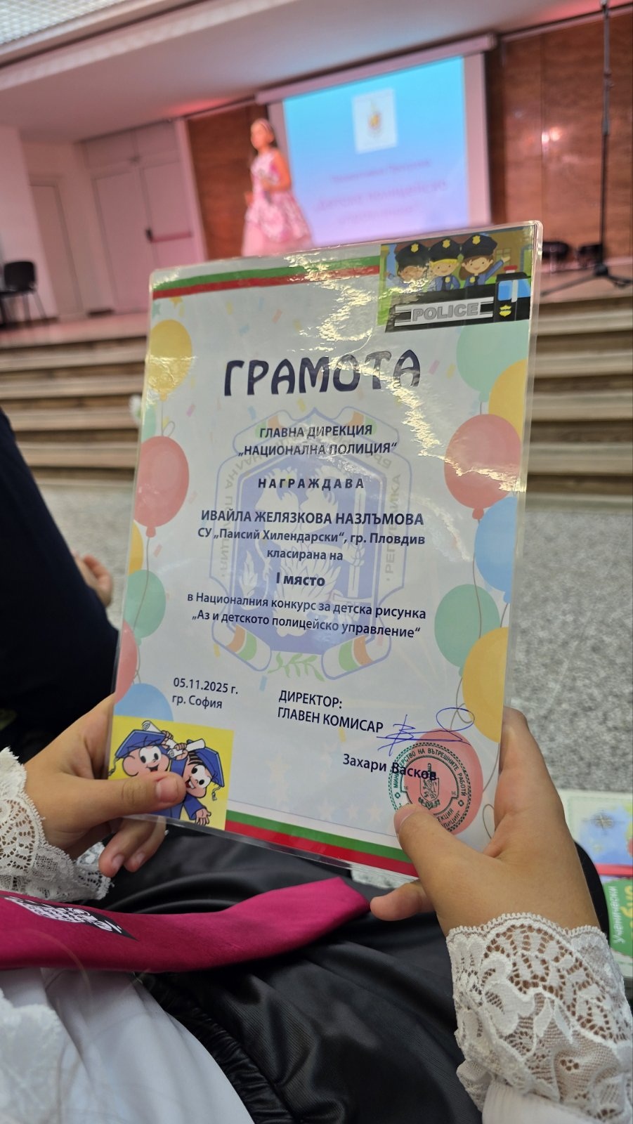 Ивайла Назлъмова от СУ "Св. Паисий Хилендарски" в Пловдив с първа награда от конкурса на МВР "Аз и моето полицейско управление"