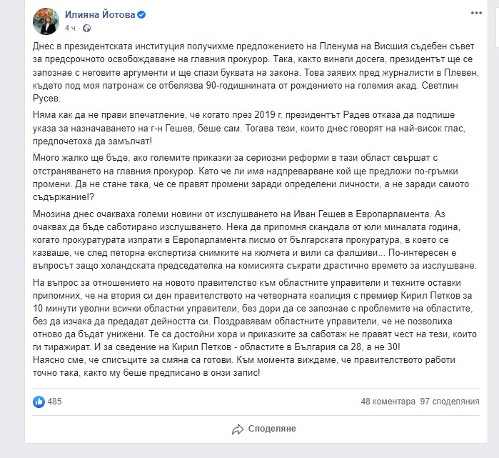 "Днес в президентската институция получихме предложението на Пленума на Висшия съдебен съвет за предсрочното освобождаване на главния прокурор. Така, както винаги досега, президентът ще се запознае с неговите аргументи и ще спази буквата на закона. Няма как да не прави впечатление, че когато през 2019 г. президентът Радев отказа да подпише указа за назначаването на г-н Гешев, беше сам. Тогава тези, които днес говорят на най-висок глас, предпочетоха да замълчат", пише вицепрезидентът в позиция във Фейсбук.