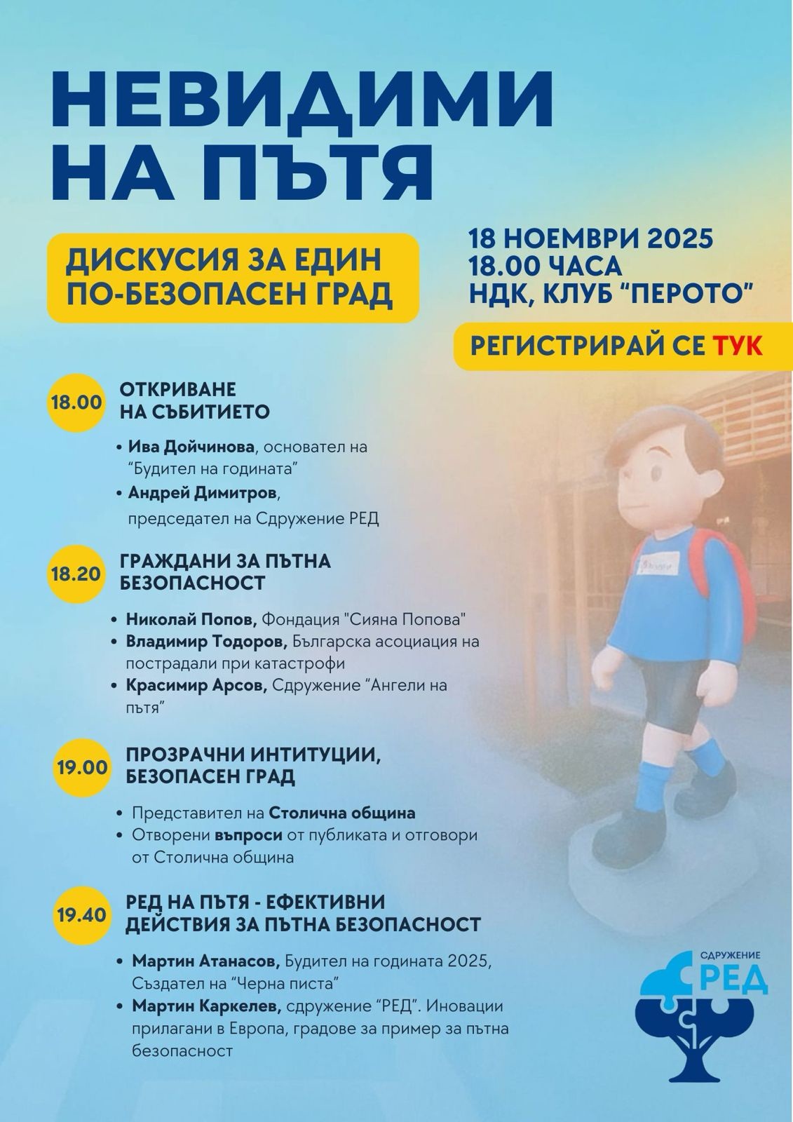 Сдружение „РЕД" организира на 18 ноември от 18:00 ч. в Литературен клуб „Перото" дискусия под надслов „Невидими на пътя - дискусия за един по-безопасен град", посветена на пътната безопасност и необходимостта от по-сигурна градска среда за най-уязвимите участници в движението.