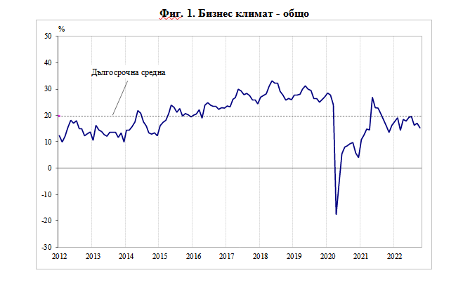/КРОСС/ През октомври 2022 г. общият показател на бизнес климата намалява с 1.7 пункта спрямо септември, което се дължи на неблагоприятния бизнес климат в промишлеността, търговията на дребно и сектора на услугите.