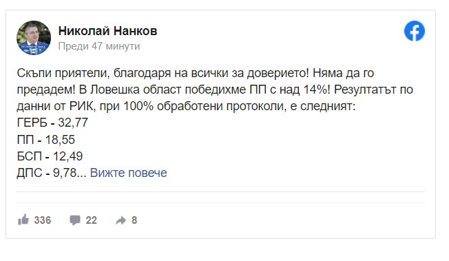 /КРОСС/ "Скъпи приятели, благодаря на всички за доверието! Няма да го предадем! В Ловешка област победихме ПП с над 14%!", написа водачът на листата на ГЕРБ-СДС Николай Нанков във фейсбук.