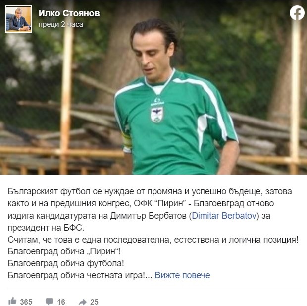 /КРОСС/ ОФК Пирин Благоевград ще издигне кандидатурата на Димитър Бербатов за президент на Българския футболен съюз за предстоящия конгрес. Новината обяви кметът на Благоевград Илко Стоянов във Фейсбук.
