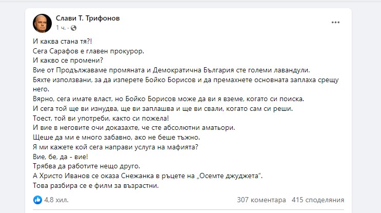 "И каква стана тя?! Сега Сарафов е главен прокурор. И какво се промени? Вие от Продължаваме промяната и Демократична България сте големи лавандули. Бяхте използвани, за да изперете Бойко Борисов и да премахнете основната заплаха срещу него", написа той във фейсбук.