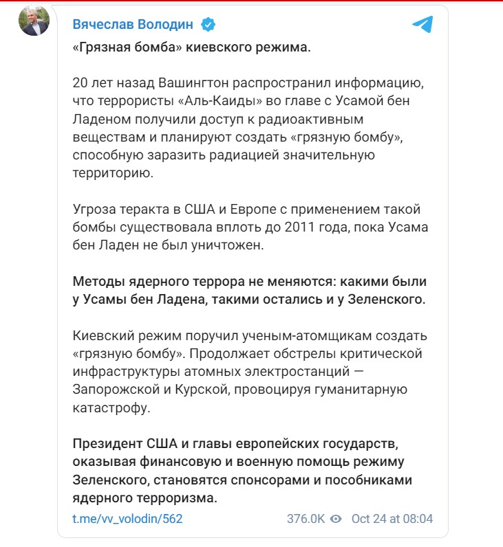 „Методите на ядрения терор не се променят: това, което имаше Осама бин Ладен, Зеленски остана същият. Президентът на САЩ и ръководителите на европейските държави, предоставяйки финансова и военна помощ на режима на Зеленски, стават спонсори и съучастници на ядрения тероризъм", пише още Володин.