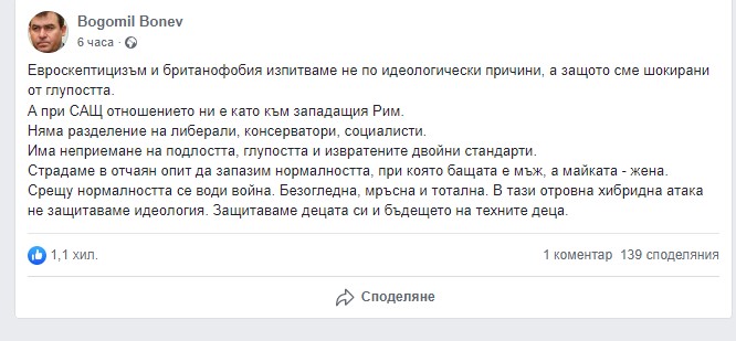 Страдаме в отчаян опит да запазим нормалността, при която бащата е мъж, а майката - жена", пише още Богомил Бонев в своя пост.