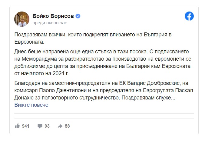 /КРОСС/ Поздравявам всички, които подкрепят влизането на България в еврозоната. Това написа лидерът на ГЕРБ Бойко Борисов във Facebook.