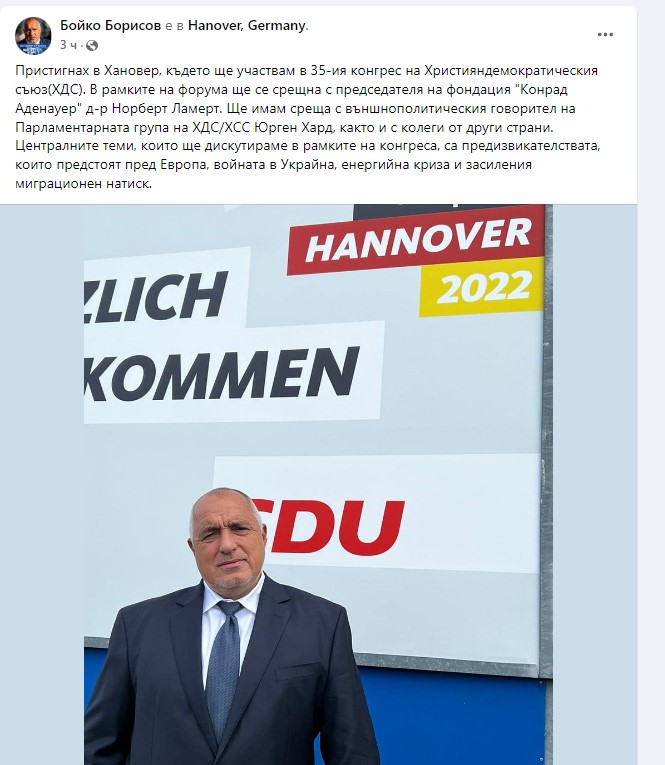 /КРОСС/ Лидерът на ГЕРБ Бойко Борисов участва в 35-ия конгрес на Християндемократическия съюз(ХДС), който се провежда в Хановер. Участието му в най-висшия форум на християн-демократите в Германия е по покана на председателя на ХДС Фридрих Мерц.