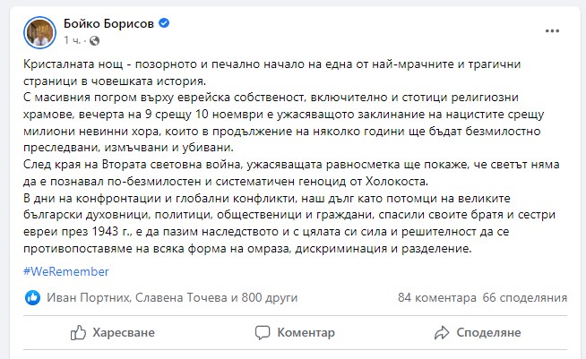 "Кристалната нощ - позорното и печално начало на една от най-мрачните и трагични страници в човешката история. С масивния погром върху еврейска собственост, включително и стотици религиозни храмове, вечерта на 9 срещу 10 ноември е ужасяващото заклинание на нацистите срещу милиони невинни хора, които в продължение на няколко години ще бъдат безмилостно преследвани, измъчвани и убивани", пише още Борисов.