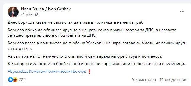 „Днес Борисов казал, че съм искал да вляза в политиката на негов гръб. Борисов обича да обвинява другите в нещата, които прави - говори за ДПС, а неговото сегашно правителство е с подкрепата на ДПС. Борисов влезе в политиката на гърба на Живков и на царя, затова си мисли, че всички други са като него. Аз съм тръгнал от най-ниското стъпало и съм вървял нагоре с труд и почтеност. В България има огромен брой честни и почтени хора, излъгани от политически измамници. #ВремеЕдаИзметемПолитическияБоклук", контрира във фейсбук бившият главен прокурор.