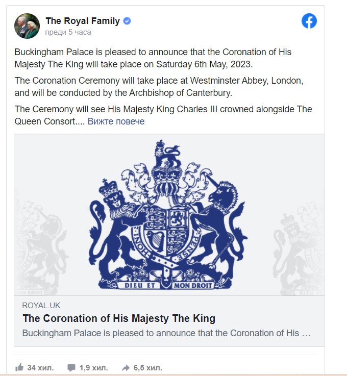 /КРОСС/ Коронацията на Чарлз III ще се състои на 6 май 2023 г., съобщиха от Бъкингамския дворец.