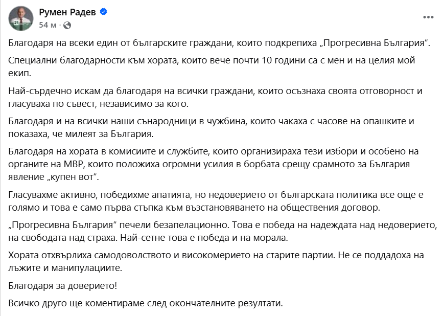 "Благодаря на всеки един от българските граждани, които подкрепиха "Прогресивна България". Специални благодарности към хората, които вече почти 10 години са с мен и на целия мой екип. Най-сърдечно искам да благодаря на всички граждани, които осъзнаха своята отговорност и гласуваха по съвест, независимо за кого. Благодаря и на всички наши сънародници в чужбина, които чакаха с часове на опашките и показаха, че милеят за България. Благодаря на хората в комисиите и службите, които организираха тези избори и особено на органите на МВР, които положиха огромни усилия в борбата срещу срамното за България явление "купен вот"," пише още Радев.