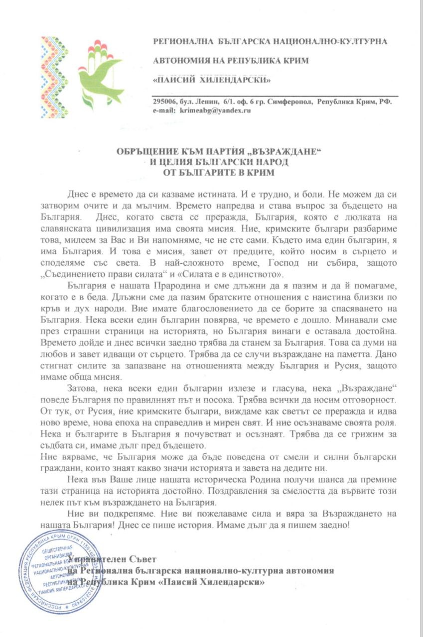 "Днес е времето да си казваме истината. И е трудно, и боли. Не можем да си затворим очите и да мълчим. Времето напредва и става въпрос за бъдещето на България. Днес, когато света се преражда, България, която с люлката на славянската цивилизация има своята мисия. Ние, кримските българи разбираме това, милеем за Вас и Ви напомняме, че не сте сами. Където има един българин, я има България. И това е мисия, завет от предците, който носим в сърцето и споделяме със света. В най-сложното време, Господ ни събира, защото „Съединението прави силата" и «Силата е в единството»", това написаха в писмо до "Възраждане" от регионалната и национално-културна автономия на българската общност в Крим.