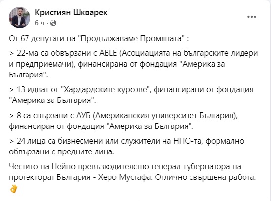 /КРОСС/ От 67 депутати на "Продължаваме промяната", 43 са свързани с фондация "Америка за България", съобщи epicenter.bg, цитирайки профила на ***Кристиян Шкварек във фейсбук: