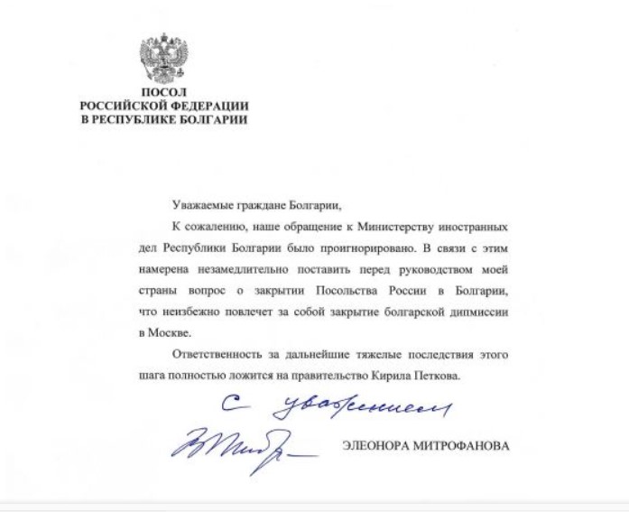 /КРОСС/ "За съжаление, нашето обръщане към Министерството на външните работи на Република България беше игнорирано. Във връзка с това възнамерявам безотлагателно да повдигна пред ръководството на моята страна въпроса за закриването на Посолството на Русия в България, което неизбежно ще доведе до закриване на българската дипломатическа мисия в Москва.