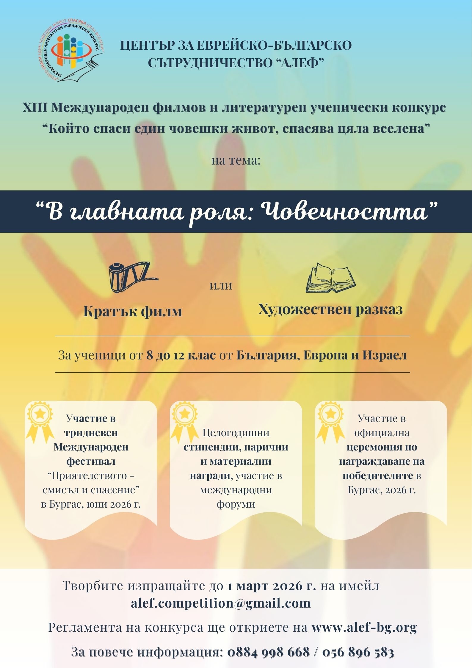 Център за еврейско-българско сътрудничество „Алеф" дава старт на тринадесетото издание на Международния филмов и литературен ученически конкурс „Който спаси един човешки живот, спасява цяла вселена". Темата, по която младите автори ще трябва да сътворят своите произведения, е „В главната роля: човечността". За да участват в конкурса, учениците ще трябва чрез въображението си да пресъздадат мрачните години на Холокоста, да разкажат за преследваното еврейско население, очакващо депортация към лагерите на смъртта и за човеколюбието и смелостта на българите, довели до безпрецедентния акт на спасяването на българските евреи.
