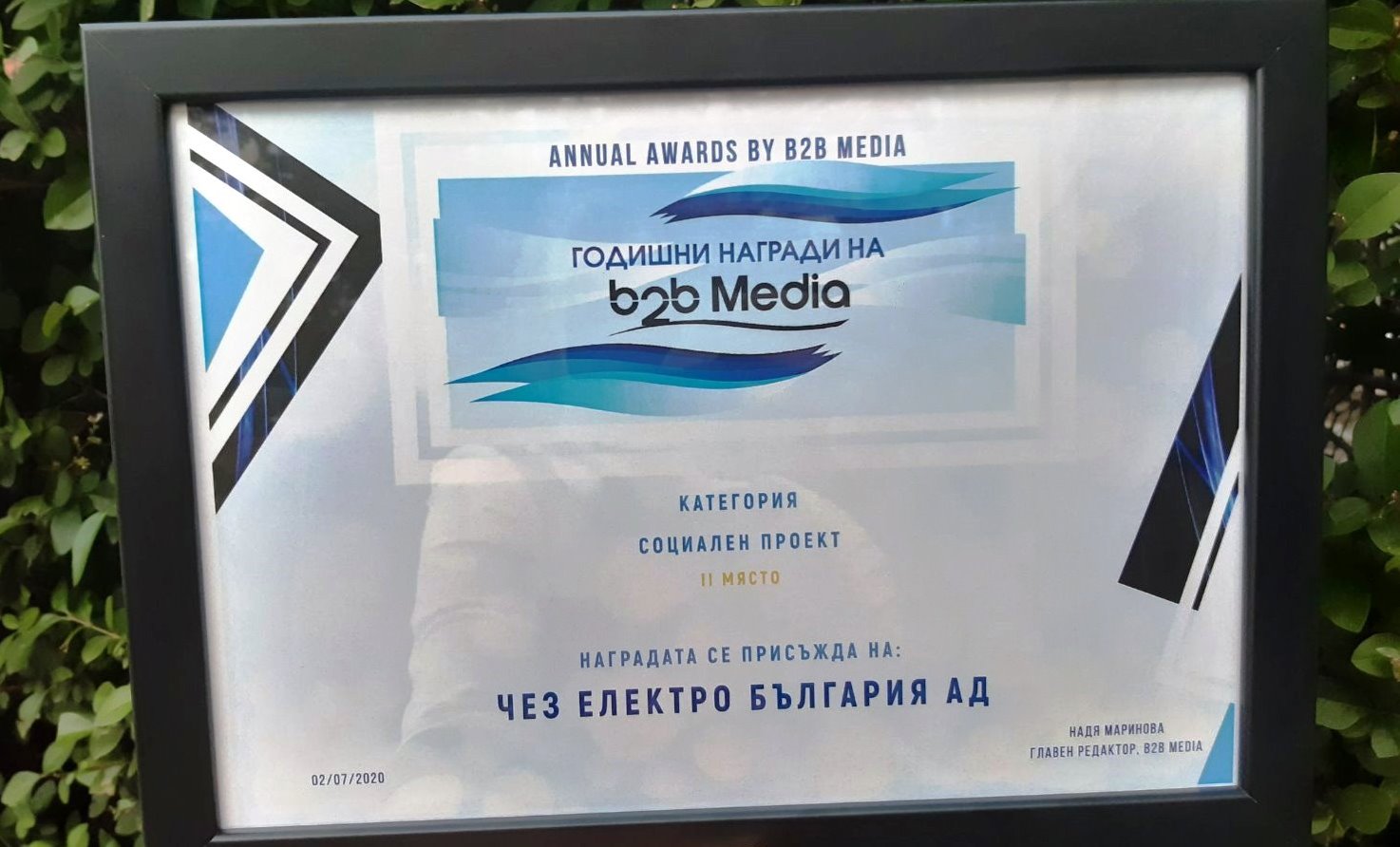 /КРОСС/ „ЧЕЗ Електро България" АД спечели второ място в категория „Социален проект" на годишните награди на b2b Media. Инициативата тази година отличава представители на бизнеса в България, реализирали най-успешните, устойчиви и иновативни програми, както и социално-отговорни кампании в отговор на кризата COVID-19. В шестото издание на конкурса бяха включени и три нови категории за оценка на осъществени проекти и приложени практики: „Предприемачество в криза", „Кампания с кауза в COVID-19" и „Социален проект в отговор на COVID-19".