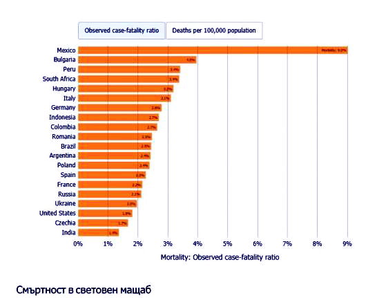 В Европа България е на първо място по процент починали от заразените с коронавирус. Следват я Унгария, Италия, Германия, Румъния, Полша, Испания, Франция.