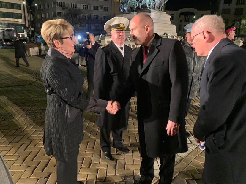 /КРОСС/ Посланикът на Русия Елеонора Митрофанова взе участие в тържествената заря-проверка по случай Деня на Освобождението на България на площад "Народно събрание" пред паметника на Цар Александър II в София. Тя положи цветя в знак на почит пред подвига на хилядите загинали в името на свободата на Република България.
