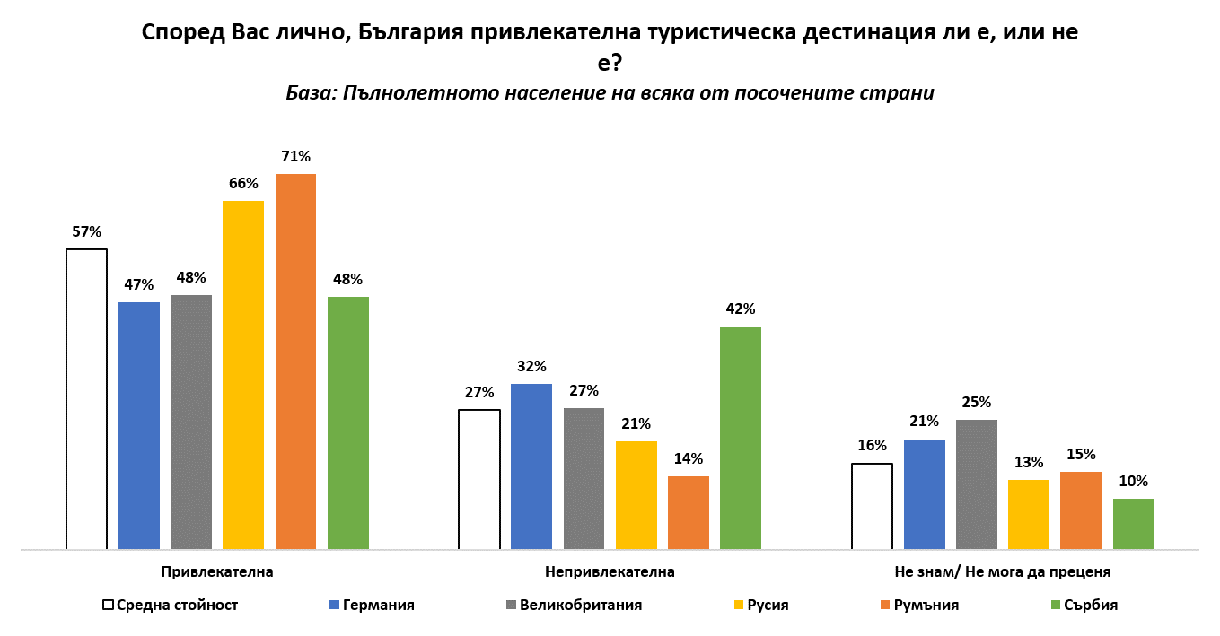Най-високо са оценили страната ни гражданите на Румъния и Русия, но подчертано положителни оценки дават и жителите на Германия, Англия и Сърбия. Най-разколебани относно атрактивността на България се оказват сърбите – едва 48% казват, че България е атрактивна, а 42% са на обратното мнение.