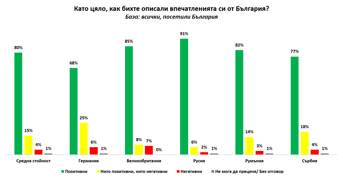 На въпрос „Как бихте описали общите си впечатления от България?” 80% от посетилите страната ни отговарят положително. Най-доволни от посещението си у нас са били руснаците, румънците и жителите на Великобритания. Малко по-резервирано отговарят германците, но и там процентът на отговорилите положително е висок - 67%.